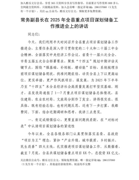 【七哥公文】2025年:【七哥公文】常务副县长在2025年全县重点项目谋划储备工作推进会上的讲话+更多免费公文+VX:QiGeGongWen2024+更多免费公文+VX:QiGeGongWen2024