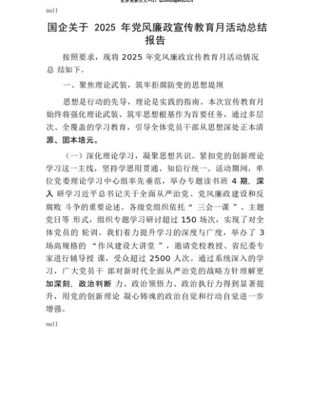 【七哥公文】2025年:【七哥公文】国企关于2025年X风廉政宣传教育月活动总结报告+更多免费公文+VX:QiGeGongWen2024+更多免费公文+VX:QiGeGongWen2024