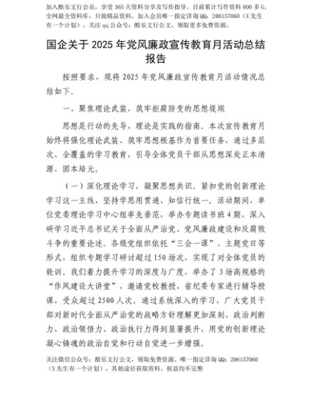【七哥公文】2025年:【七哥公文】国企关于2025年X风廉政宣传教育月活动总结报告+更多免费公文+VX:QiGeGongWen2024+更多免费公文+VX:QiGeGongWen2024