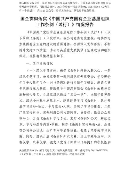 【七哥公文】2025年:【七哥公文】国企贯彻落实《中国共产X国有企业基层组织工作条例(试行)》情况报告+更多免费公文+VX:QiGeGongWen2024+更多免费公文+VX:QiGeGongWen2024