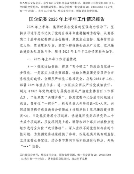 【七哥公文】2025年:【七哥公文】国企纪委2025年上半年工作情况报告+更多免费公文+VX:QiGeGongWen2024+更多免费公文+VX:QiGeGongWen2024