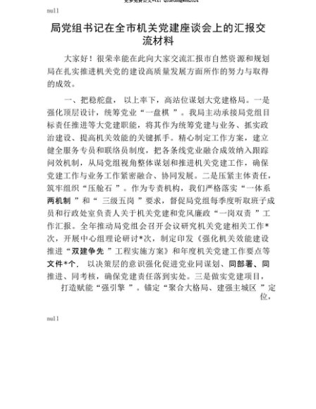 【七哥公文】2025年:【七哥公文】局X组书记在全市机关X建座谈会上的汇报交流材料+更多免费公文+VX:QiGeGongWen2024+更多免费公文+VX:QiGeGongWen2024