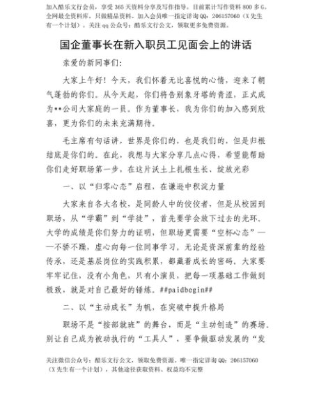 【七哥公文】2025年:【七哥公文】国企董事长在新入职员工见面会上的讲话+更多免费公文+VX:QiGeGongWen2024+更多免费公文+VX:QiGeGongWen2024