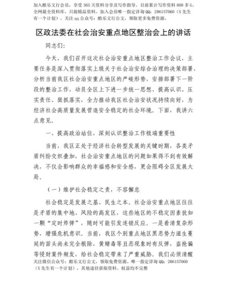 【七哥公文】2025年:【七哥公文】区政法委在社会治安重点地区整治会上的讲话+更多免费公文+VX:QiGeGongWen2024+更多免费公文+VX:QiGeGongWen2024