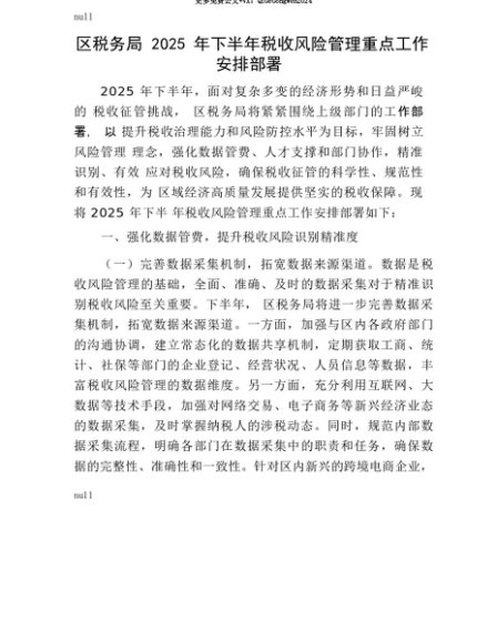 【七哥公文】2025年:【七哥公文】区税务局2025年下半年税收风险管理重点工作安排部署+更多免费公文+VX:QiGeGongWen2024+更多免费公文+VX:QiGeGongWen2024