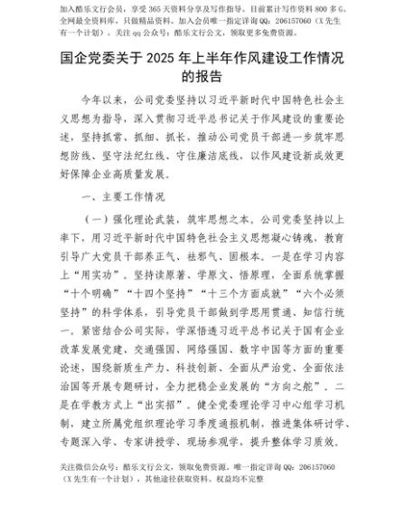 【七哥公文】2025年:【七哥公文】国企X委关于2025年上半年作风建设工作情况的报告+更多免费公文+VX:QiGeGongWen2024+更多免费公文+VX:QiGeGongWen2024