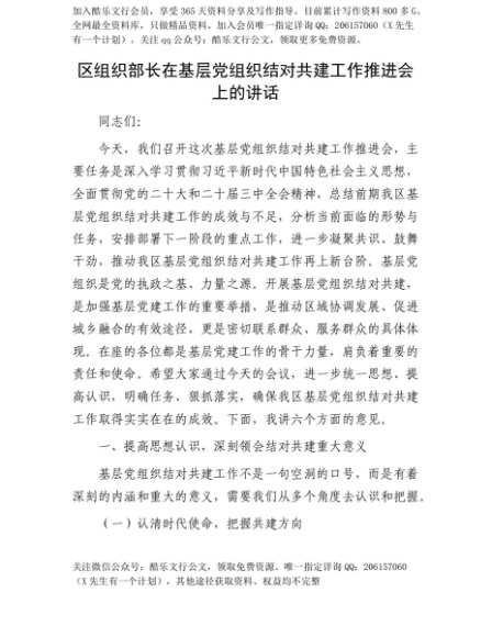 【七哥公文】2025年:【七哥公文】区组织部长在基层X组织结对共建工作推进会上的讲话+更多免费公文+VX:QiGeGongWen2024+更多免费公文+VX:QiGeGongWen2024