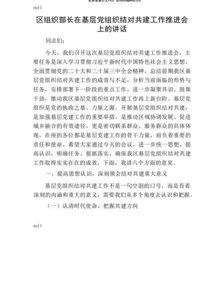 【七哥公文】2025年:【七哥公文】区组织部长在基层X组织结对共建工作推进会上的讲话+更多免费公文+VX:QiGeGongWen2024+更多免费公文+VX:QiGeGongWen2024