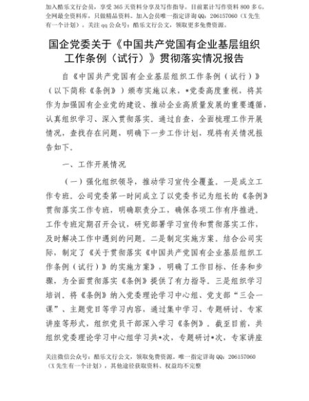 【七哥公文】2025年:【七哥公文】国企X委关于《中国共产X国有企业基层组织工作条例(试行)》贯彻落实情况报告+更多免费公文+VX:QiGeGongWen2024+更多免费公文+VX:QiGeGongWen2024