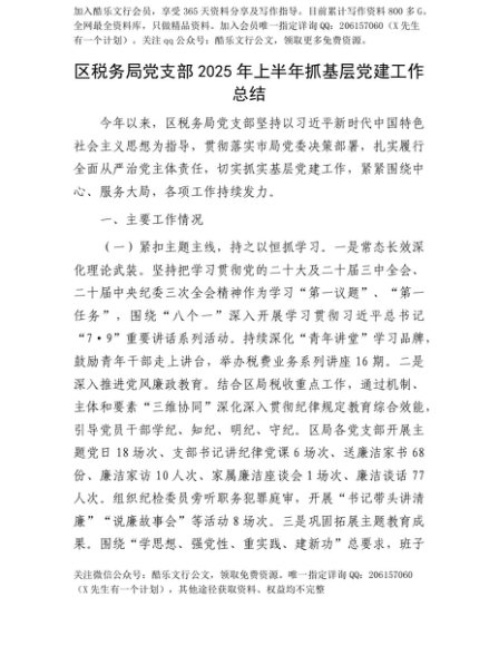 【七哥公文】2025年:【七哥公文】区税务局X支部2025年上半年抓基层X建工作总结+更多免费公文+VX:QiGeGongWen2024+更多免费公文+VX:QiGeGongWen2024