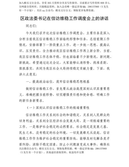 【七哥公文】2025年:【七哥公文】区政法委书记在信访维稳工作调度会上的讲话+更多免费公文+VX:QiGeGongWen2024+更多免费公文+VX:QiGeGongWen2024