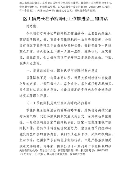 【七哥公文】2025年:【七哥公文】区工信局长在节能降耗工作推进会上的讲话+更多免费公文+VX:QiGeGongWen2024+更多免费公文+VX:QiGeGongWen2024