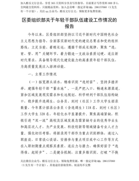 【七哥公文】2025年:【七哥公文】区委组织部关于年轻干部队伍建设工作情况的报告+更多免费公文+VX:QiGeGongWen2024+更多免费公文+VX:QiGeGongWen2024