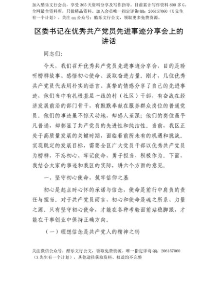 【七哥公文】2025年:【七哥公文】区委书记在优秀共产X员先进事迹分享会上的讲话+更多免费公文+VX:QiGeGongWen2024+更多免费公文+VX:QiGeGongWen2024