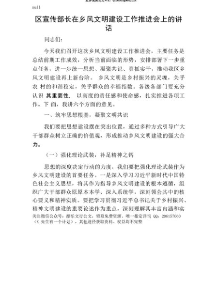 【七哥公文】2025年:【七哥公文】区宣传部长在乡风文明建设工作推进会上的讲话+更多免费公文+VX:QiGeGongWen2024+更多免费公文+VX:QiGeGongWen2024