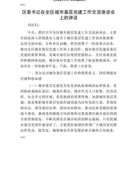 【七哥公文】2025年:【七哥公文】区委书记在全区城市基层X建工作交流座谈会上的讲话+更多免费公文+VX:QiGeGongWen2024+更多免费公文+VX:QiGeGongWen2024