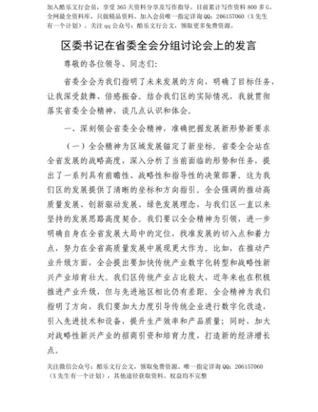 【七哥公文】2025年:【七哥公文】区委书记在省委全会分组讨论会上的发言+更多免费公文+VX:QiGeGongWen2024+更多免费公文+VX:QiGeGongWen2024