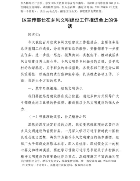 【七哥公文】2025年:【七哥公文】区宣传部长在乡风文明建设工作推进会上的讲话+更多免费公文+VX:QiGeGongWen2024+更多免费公文+VX:QiGeGongWen2024