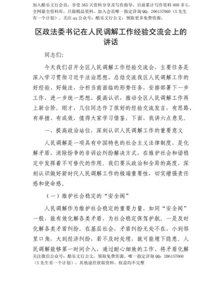 【七哥公文】2025年:【七哥公文】区政法委书记在人民调解工作经验交流会上的讲话+更多免费公文+VX:QiGeGongWen2024+更多免费公文+VX:QiGeGongWen2024