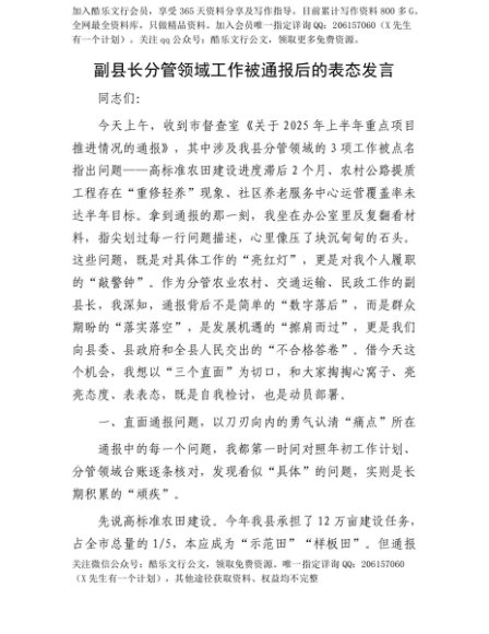 【七哥公文】2025年:【七哥公文】副县长分管领域工作被通报后的表态发言+更多免费公文+VX:QiGeGongWen2024+更多免费公文+VX:QiGeGongWen2024