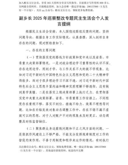 【七哥公文】2025年:【七哥公文】副乡长2025年巡察整改专题民主生活会个人发言提纲+更多免费公文+VX:QiGeGongWen2024+更多免费公文+VX:QiGeGongWen2024