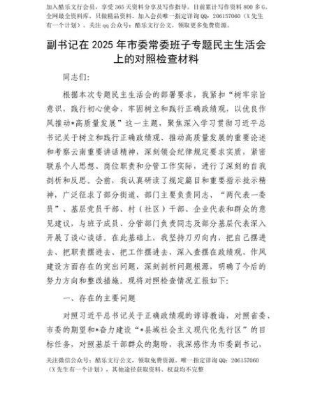 【七哥公文】2025年:【七哥公文】副书记在2025年市委常委班子专题民主生活会上的对照检查材料+更多免费公文+VX:QiGeGongWen2024+更多免费公文+VX:QiGeGongWen2024