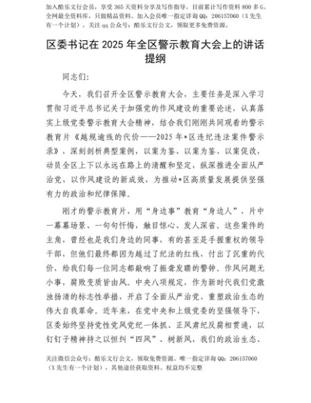 【七哥公文】2025年:【七哥公文】区委书记在2025年全区警示教育大会上的讲话提纲+更多免费公文+VX:QiGeGongWen2024+更多免费公文+VX:QiGeGongWen2024