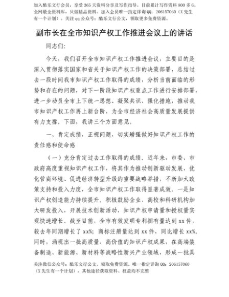 【七哥公文】2025年:【七哥公文】副市长在全市知识产权工作推进会议上的讲话+更多免费公文+VX:QiGeGongWen2024+更多免费公文+VX:QiGeGongWen2024