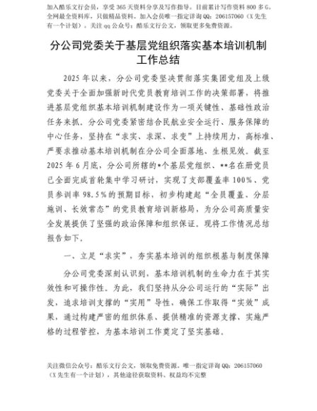 【七哥公文】2025年:【七哥公文】分公司X委关于基层X组织落实基本培训机制工作总结+更多免费公文+VX:QiGeGongWen2024+更多免费公文+VX:QiGeGongWen2024