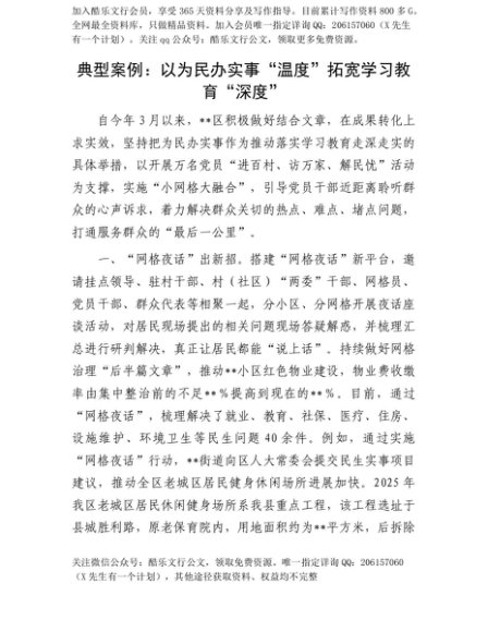 【七哥公文】2025年:【七哥公文】典型案例:以为民办实事“温度”拓宽学习教育“深度”+更多免费公文+VX:QiGeGongWen2024+更多免费公文+VX:QiGeGongWen2024