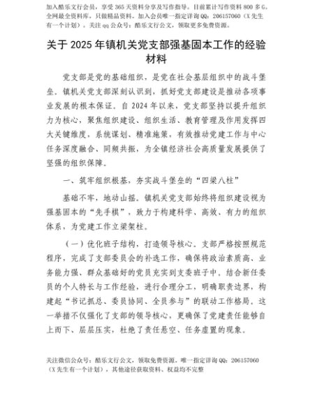 【七哥公文】2025年:【七哥公文】关于2025年镇机关X支部强基固本工作的经验材料+更多免费公文+VX:QiGeGongWen2024+更多免费公文+VX:QiGeGongWen2024