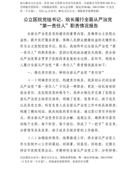 【七哥公文】2025年:【七哥公文】公立医院X组书记、院长履行全面从严治X“第一责任人”职责情况报告+更多免费公文+VX:QiGeGongWen2024+更多免费公文+VX:QiGeGongWen2024