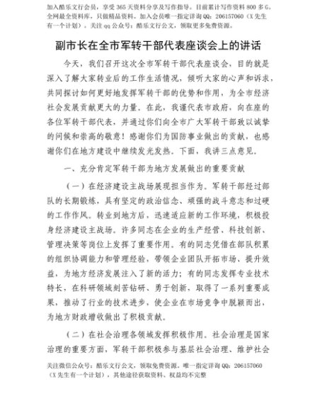 【七哥公文】2025年:【七哥公文】副市长在全市军转干部代表座谈会上的讲话+更多免费公文+VX:QiGeGongWen2024+更多免费公文+VX:QiGeGongWen2024