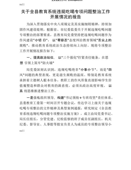 【七哥公文】2025年:【七哥公文】关于全县教育系统违规吃喝专项问题整治工作开展情况的报告+更多免费公文+VX:QiGeGongWen2024+更多免费公文+VX:QiGeGongWen2024