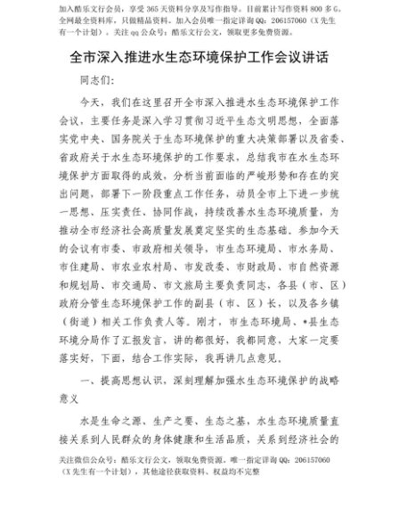 【七哥公文】2025年:【七哥公文】全市深入推进水生态环境保护工作会议讲话+更多免费公文+VX:QiGeGongWen2024+更多免费公文+VX:QiGeGongWen2024