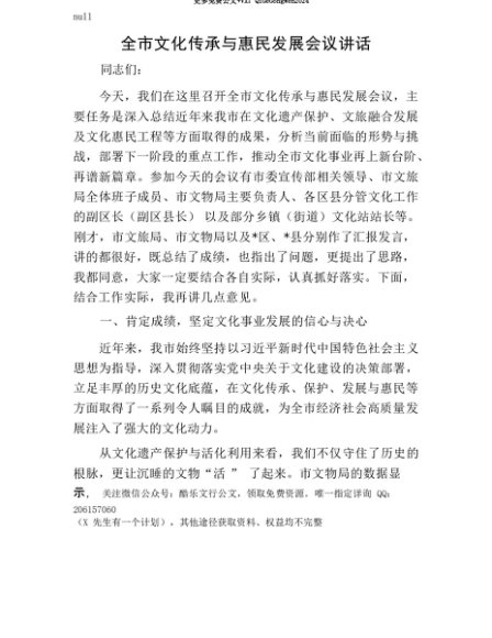 【七哥公文】2025年:【七哥公文】全市文化传承与惠民发展会议讲话+更多免费公文+VX:QiGeGongWen2024+更多免费公文+VX:QiGeGongWen2024