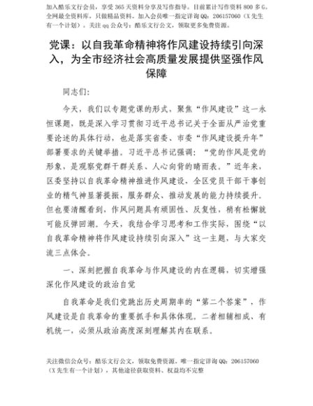 【七哥公文】2025年:【七哥公文】X课:以自我革命精神将作风建设持续引向深入,为全市经济社会高质量发展提供坚强作风保障+更多免费公文+VX:QiGeGongWen2024+更多免费公文+VX:QiGeGongWen2024