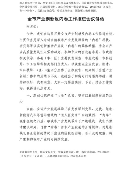 【七哥公文】2025年:【七哥公文】全市产业创新反内卷工作推进会议讲话+更多免费公文+VX:QiGeGongWen2024+更多免费公文+VX:QiGeGongWen2024