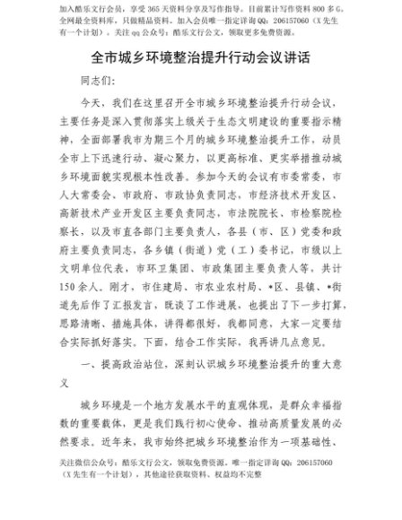 【七哥公文】2025年:【七哥公文】全市城乡环境整治提升行动会议讲话+更多免费公文+VX:QiGeGongWen2024+更多免费公文+VX:QiGeGongWen2024