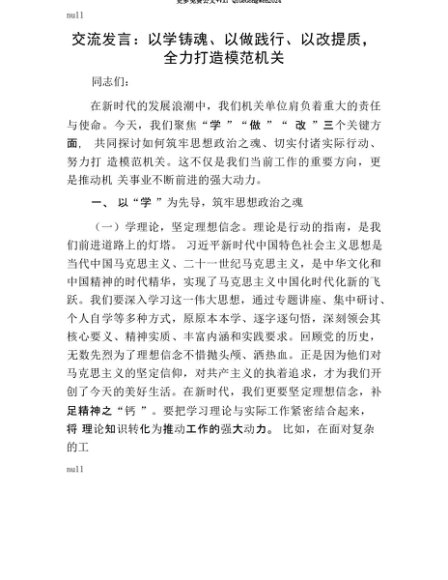 【七哥公文】2025年:【七哥公文】交流发言:以学铸魂、以做践行、以改提质,全力打造模范机关+更多免费公文+VX:QiGeGongWen2024+更多免费公文+VX:QiGeGongWen2024