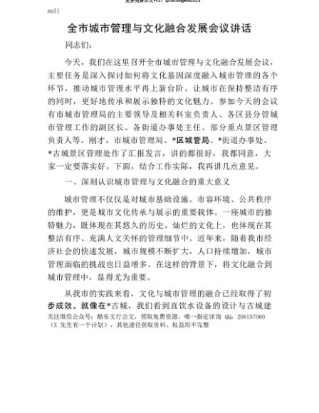 【七哥公文】2025年:【七哥公文】全市城市管理与文化融合发展会议讲话+更多免费公文+VX:QiGeGongWen2024+更多免费公文+VX:QiGeGongWen2024