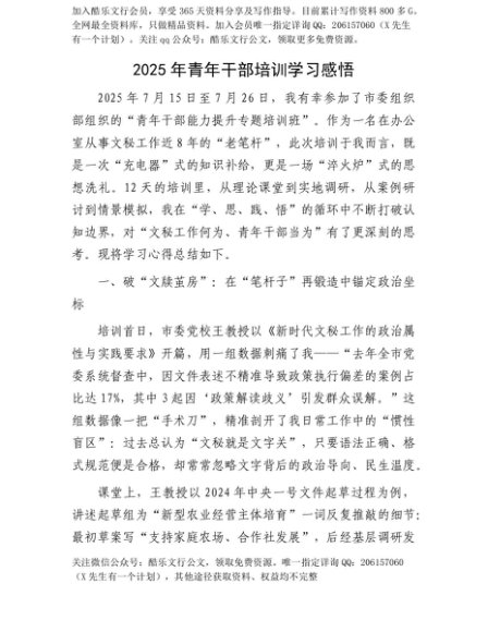 【七哥公文】2025年:【七哥公文】2025年青年干部培训学习感悟+更多免费公文+VX:QiGeGongWen2024+更多免费公文+VX:QiGeGongWen2024