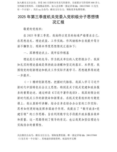 【七哥公文】2025年:【七哥公文】2025年第三季度机关X委入X积极分子思想情况汇报+更多免费公文+VX:QiGeGongWen2024+更多免费公文+VX:QiGeGongWen2024