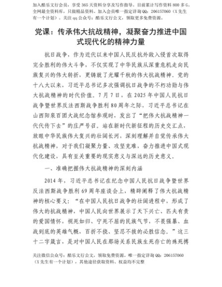 【七哥公文】2025年:【七哥公文】X课:传承伟大抗战精神,凝聚奋力推进中国式现代化的精神力量+更多免费公文+VX:QiGeGongWen2024+更多免费公文+VX:QiGeGongWen2024