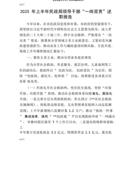 【七哥公文】2025年:【七哥公文】2025年上半年民政局领导干部“一岗双责”述职报告+更多免费公文+VX:QiGeGongWen2024+更多免费公文+VX:QiGeGongWen2024