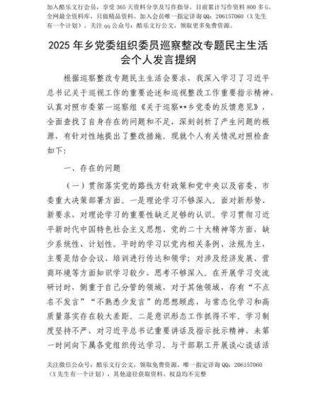 【七哥公文】2025年:【七哥公文】2025年乡X委组织委员巡察整改专题民主生活会个人发言提纲+更多免费公文+VX:QiGeGongWen2024+更多免费公文+VX:QiGeGongWen2024