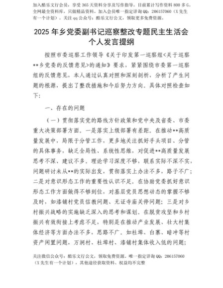 【七哥公文】2025年:【七哥公文】2025年乡X委副书记巡察整改专题民主生活会个人发言提纲+更多免费公文+VX:QiGeGongWen2024+更多免费公文+VX:QiGeGongWen2024