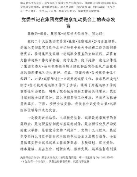 【七哥公文】2025年:【七哥公文】X委书记在集团X委巡察组动员会上的表态发言+更多免费公文+VX:QiGeGongWen2024+更多免费公文+VX:QiGeGongWen2024