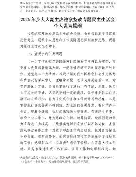 【七哥公文】2025年:【七哥公文】2025年乡人大副主席巡察整改专题民主生活会个人发言提纲_20250723_091651+更多免费公文+VX:QiGeGongWen2024+更多免费公文+VX:QiGeGongWen2024