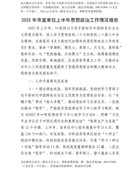【七哥公文】2025年:【七哥公文】2025年市直单位上半年思想ZZ工作情况报告+更多免费公文+VX:QiGeGongWen2024+更多免费公文+VX:QiGeGongWen2024